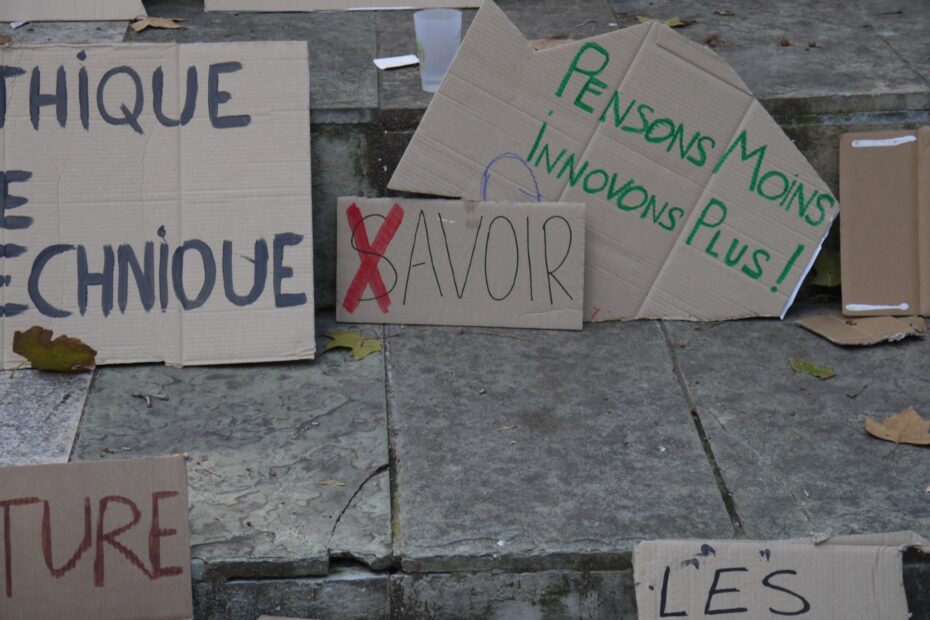 Contre la volonté de contrôle sur les connaissances produites dans l’Université au gré des idéologies réactionnaires, le Mouvement pour des savoirs engagés et reliés a choisi d’illustrer les dérives actuelles avec une fausse manif de soutien à ces propositions de résolution et plus largement à une vision des savoirs tournées vers l’utilitarisme et le soutien à un projet de société toujours plus inégalitaire et injuste écologiquement. La manifestation contre l’entrisme idéologique s’est déroulé le vendredi 11 octobre, sous un soleil radieux, entre le lieu des JESER2 et Sciences Po Lyon. Voici une courte vidéo de l’ambiance et des slogans : Lien vidéo