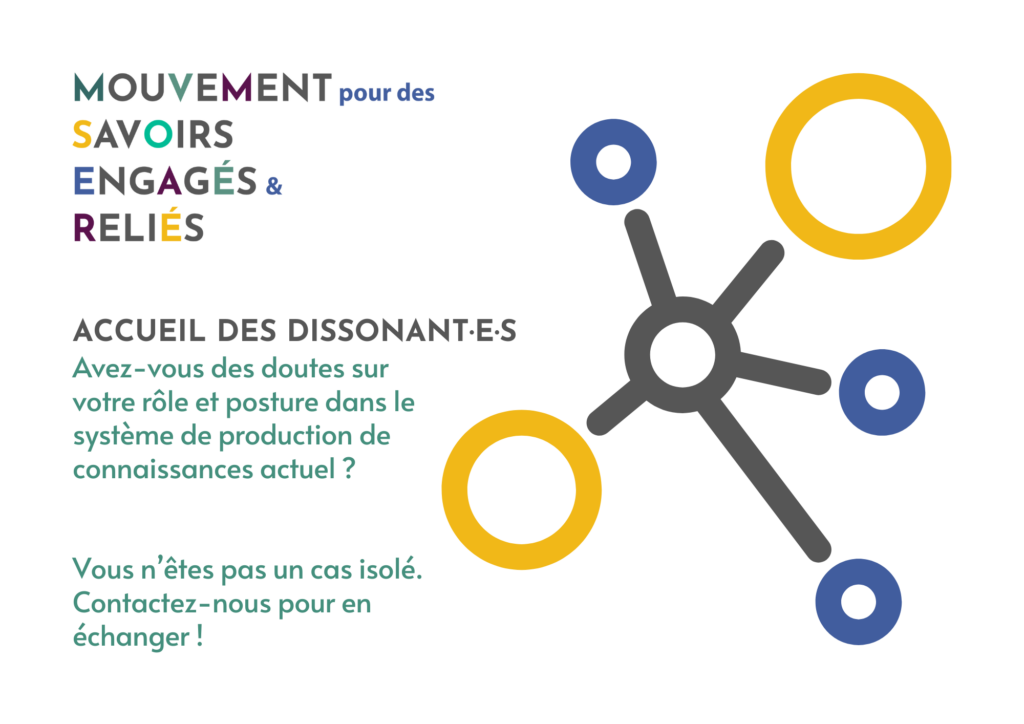 - vous tenir au courant en vous inscrivant à la liste de diffusion “Mouvement pour des Savoirs Engagés et Reliés”